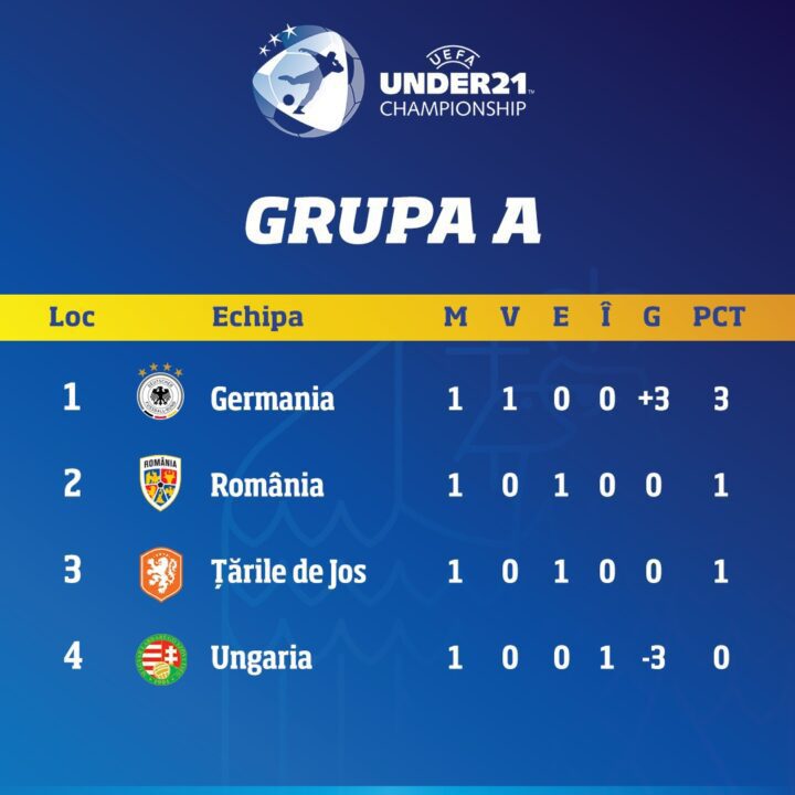 Clasamentul Grupei A după ce s-au disputat primele două meciuri. Tricolorii au remizat cu Țările de Jos, 1-1, iar în cealaltă partidă Germania a trecut de Ungaria, 3-0.