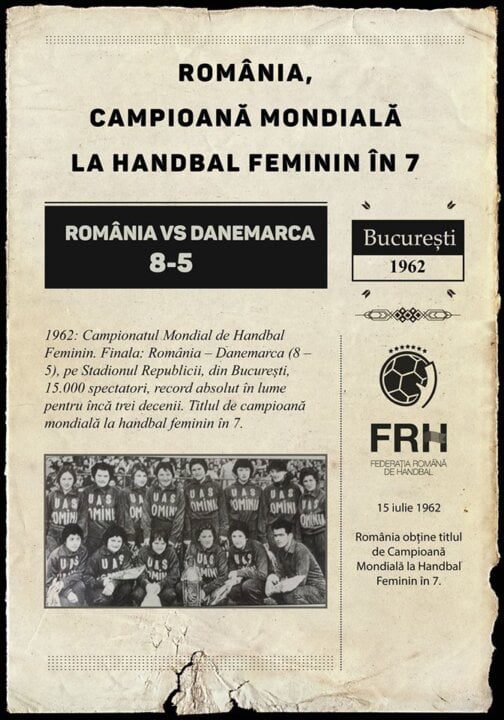 Pe 15 iulie 1962, la ora 19.00, în fața unei asistențe record de 15000 de spectatori, pe terenul cu zgură a stadionului Republicii, România învingea Danemarca cu 8-5 și se încorona în premieră campioană mondială la handbal în 7.