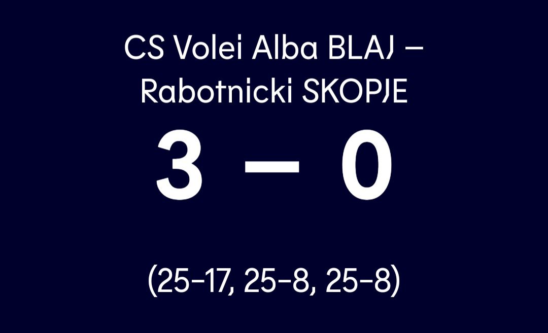 Volei Alba Blaj s-a impus marţi, pe teren propriu, în fața formaţiei Rabotnicki Skopje, scor 3-0, în manşa tur din faza 16-milor Cupei CEV.