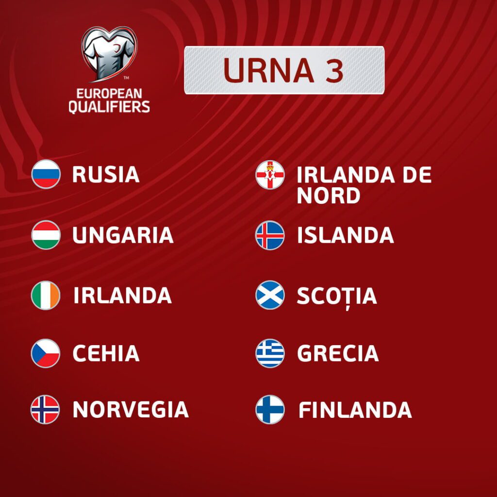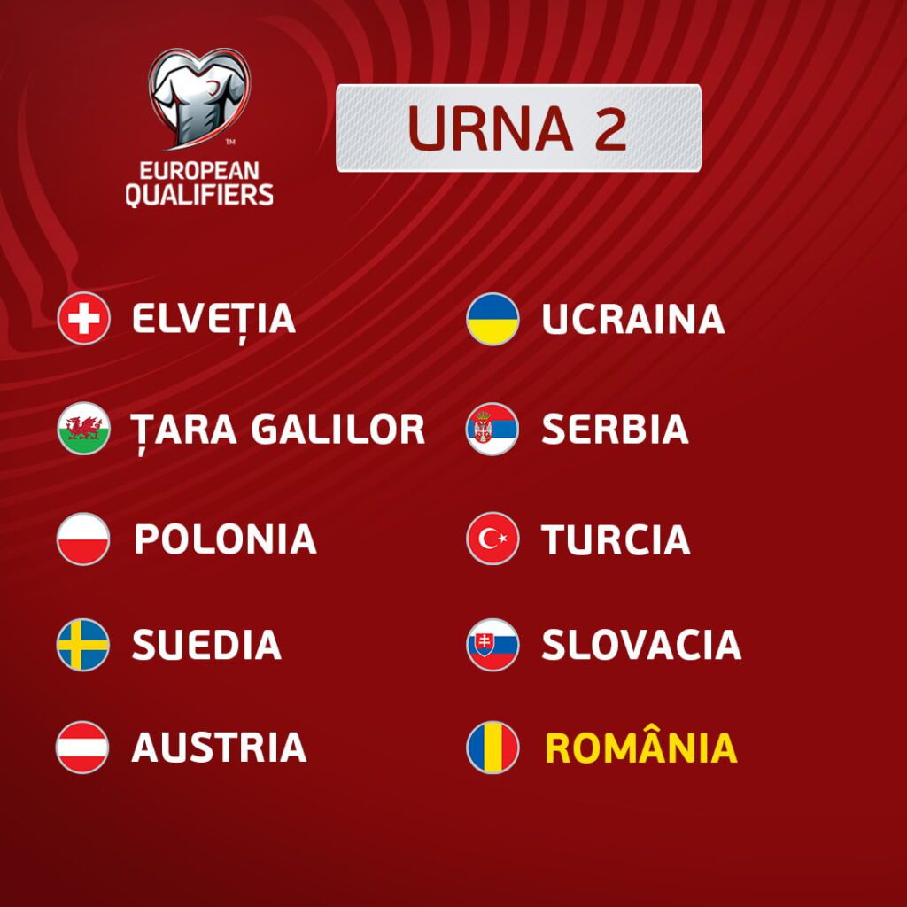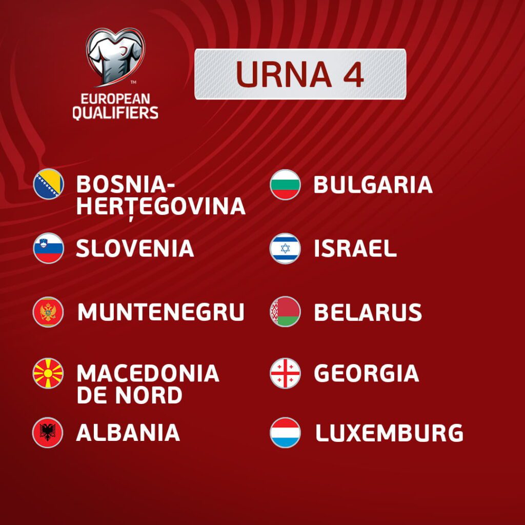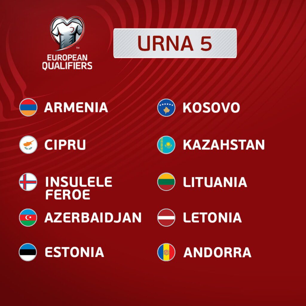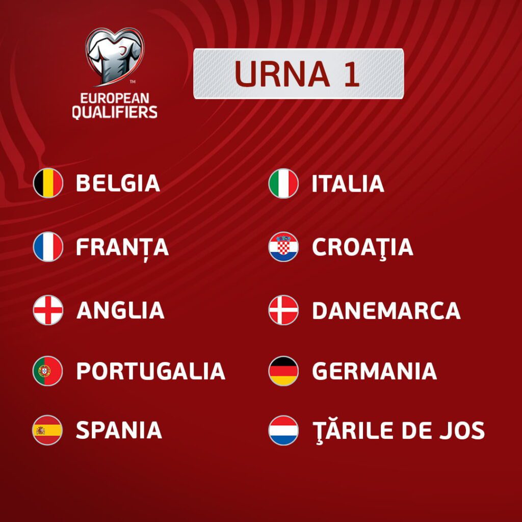Cele 55 de reprezentative europene vor fi împărțite în 6 urne valorice, primele 5 de câte 10 echipe, ultima formată din 5 echipe. Urnele se stabilesc în baza clasamentului FIFA din noiembrie, unde România se află pe locul 20 la nivel continental, așadar în urna a doua.