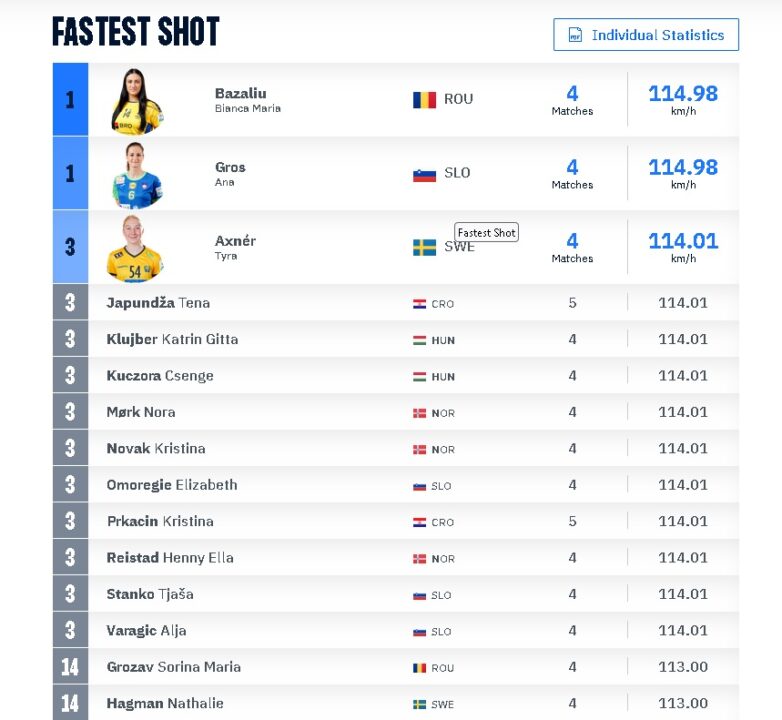 Românca este pe prima poziție în acest top, la egalitate cu slovena Ana Gros, 114,98 km/h. Următoarea în clasament este croata Tena Japundza, cu 114/01. Sorina Grozav este pe locul 12, cu 113 km/h, iar Lorena Ostase este a treia româncă din top, cu 110.99 km/h.