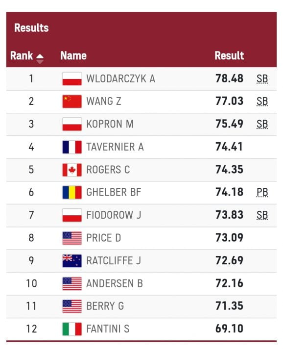 Bianca a terminat pe locul 6, cu un nou record personal aruncat din a treia încercare, 74.18m.