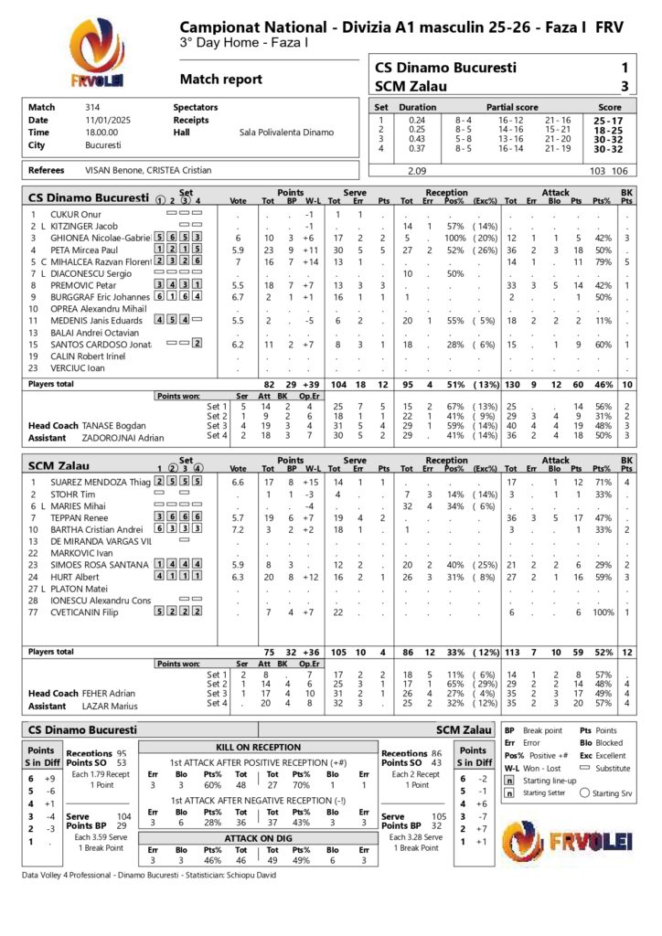 Campioana Dinamo Bucureşti a fost învinsă acasă de Zalău 1-3, sâmbătă, în etapa a 3-a a Diviziei A1 la volei masculin.