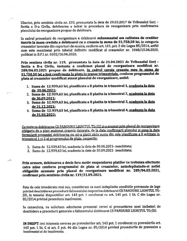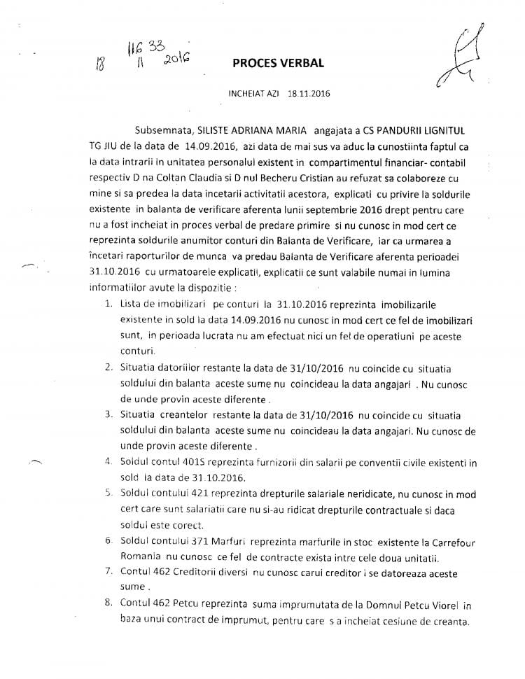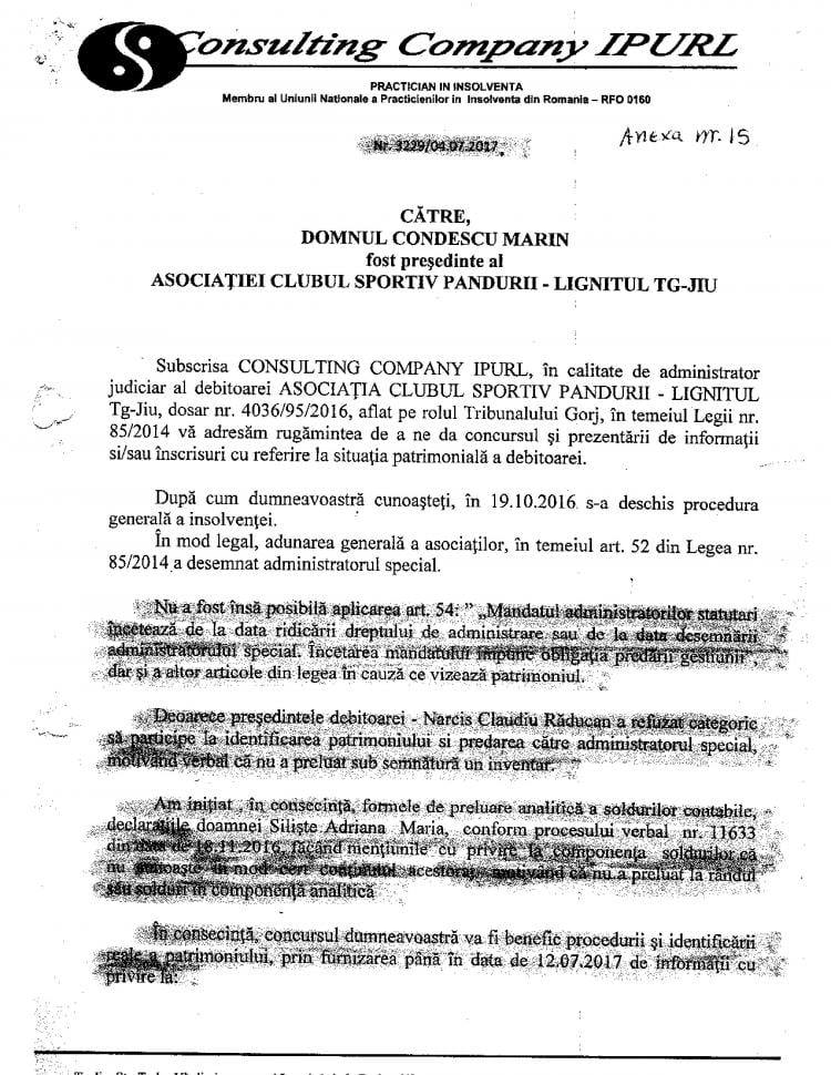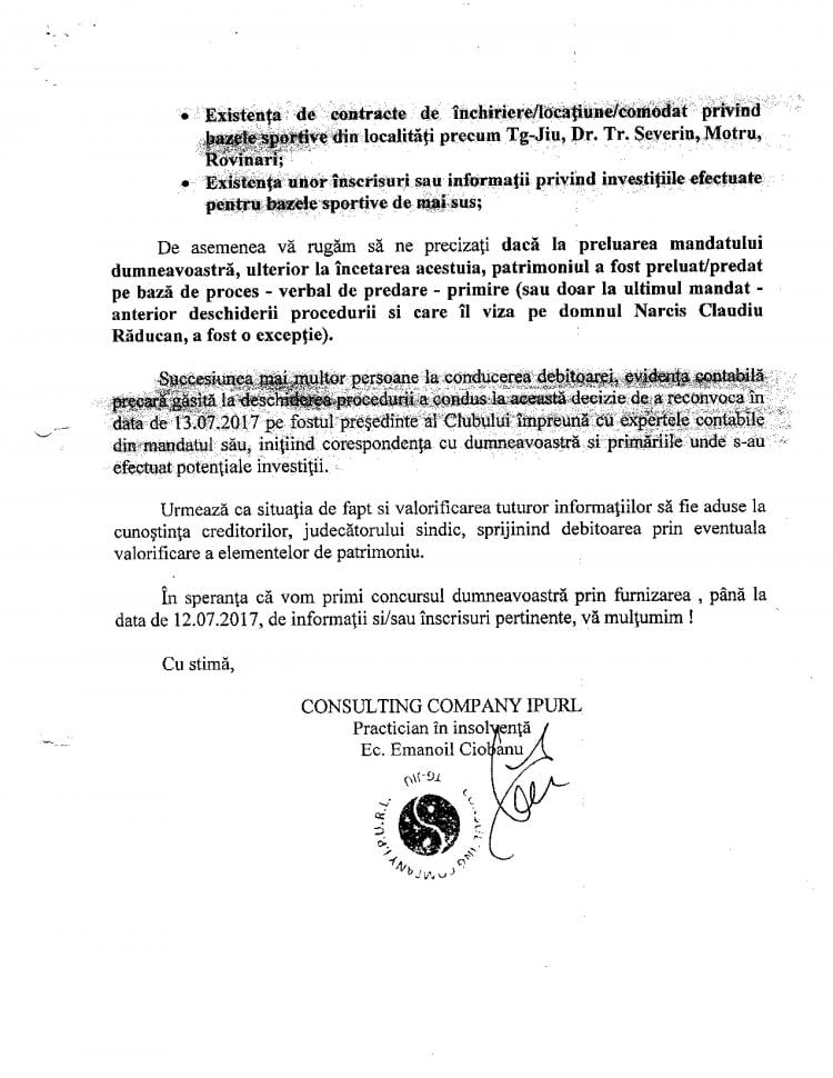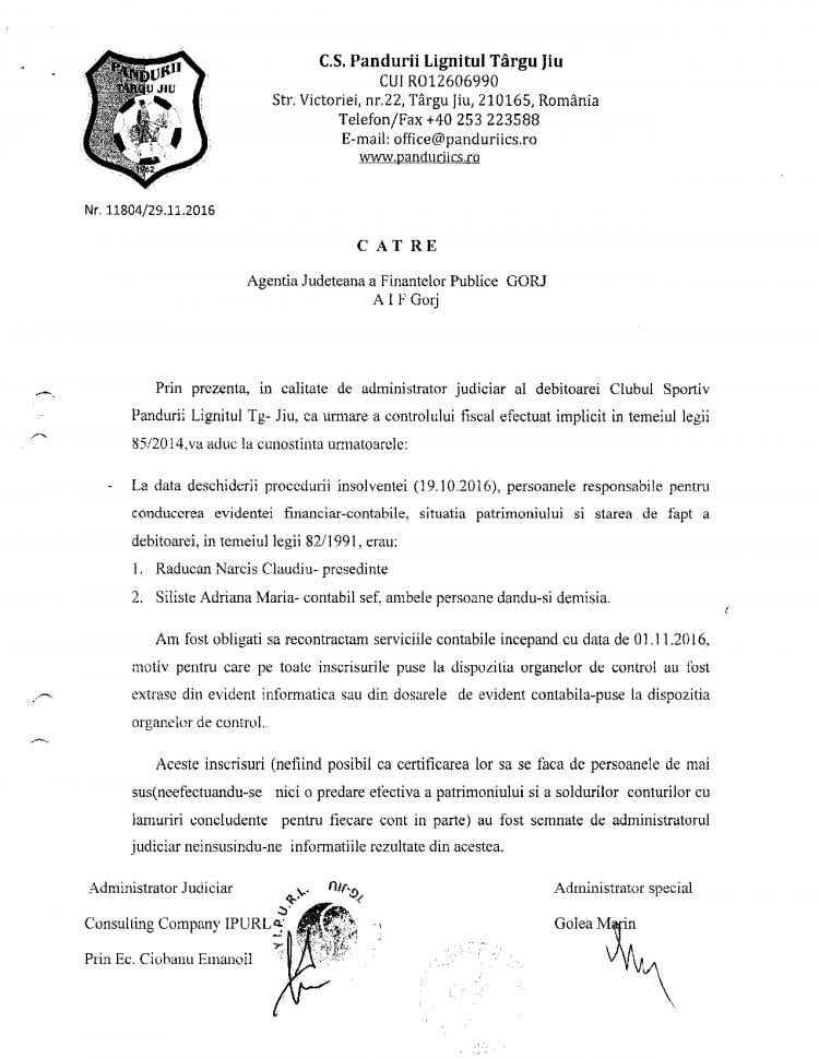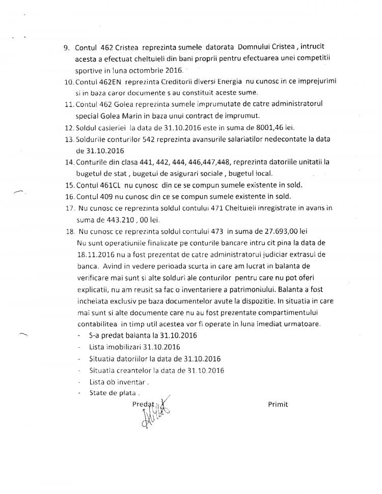 „După cum se poate observa, au fost ridicate sau transferate într-o singură zi, pentru o singură persoană, sume de neimaginat având în vedere condițiile financiare ale clubului. Jucătorii de fotbal ai clubului și salariații aveau restanțe salariale de 6-8 luni, comisiile FRF acordând licența sub condiția achitării lor până în luna octombrie. Fac precizarea că Narcis Răducan, la intrarea în insolvență, a refuzat să predea gestiunea (situația financiară, patrimoniu, etc) conform Legii 85/2014.