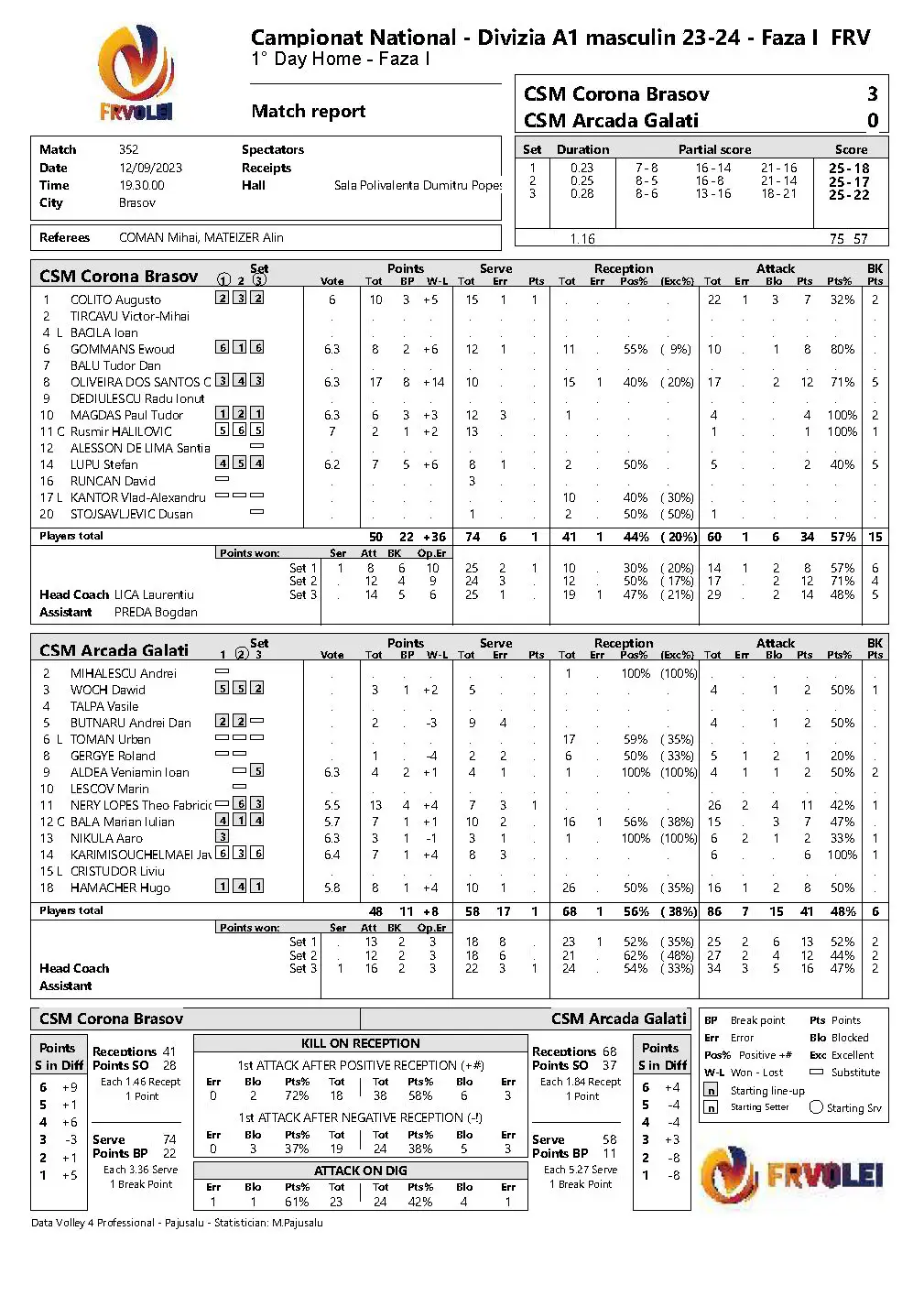 Nou promovata Corona Brașov s-a impus după o oră și 16 minute de joc. Gazdele au reușit 17 blocaje la fileu în timp ce campioana doar șase. Serviciul nu a mers pentru gălățeni, au strâns în trei seturi 17 erori.