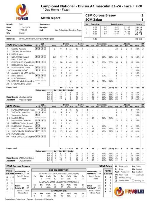 Voleibalistii pregătiți de Laurențiu Lică au avut un început de meci foarte bun reușind să câștige primele două seturi, 25-22 respetiv 25-23, dar apoi s-au relaxat. Gazdele au revenit în joc și au închis meciul în patru seturi 25-14.