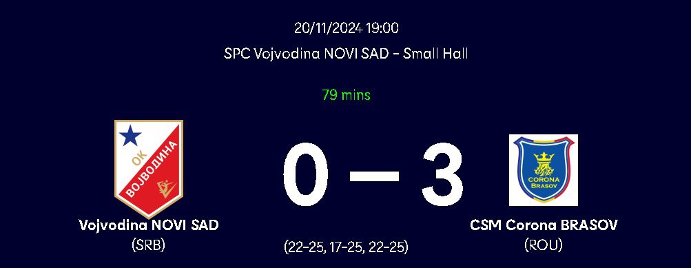 Corona Braşov s-a calificat miercuri, în deplasare, în optimile de finală ale Cupei CEV, după ce au învins formaţia sârbă Vojvodina Novi Sad, scor 3-0, în manşa retur din faza 16-lor competiţiei.
