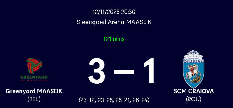 Craiova a fost învinsă miercuri, în deplasare, de echipa belgiană Greenyard Maaseik, scor 3-1, în manşa tur din turul I preliminar al Cupei CEV.