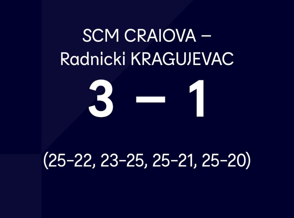SCM Craiova a învins-o miercuri, pe teren propriu, pe formaţia sârbă Radnicki Kraguevac, scor 3-1, în returul 16-ilor Cupei CEV şi s-a calificat în optimile de finală ale competiţiei.