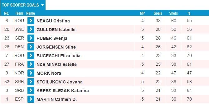 Denisa Dedu se afla pe locul al treilea in clasamentul portarilor, cu un procentaj de 42%. Dedu a reusit sa blocheze 39 de mingi din 92 de suturi. Pe locul 1 se afla portarita magiara Janurik Kinga care are un procentaj de 54% dupa patru partide disputate.