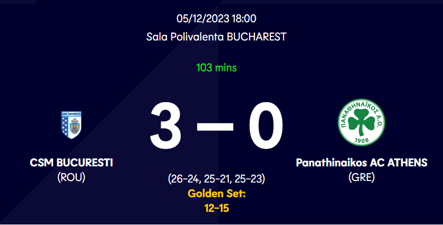 CSM Bucureşti a fost eliminată din Cupa Challenge la volei feminin de Panathinaikos AC Atena, care s-a impus în ”setul de aur” cu 15-12, marţi seara, în Sala Polivalentă din Capitală, după ce ”tigroaicele” au câştigat cu 3-0 (26-24, 25-21, 25-23) meciul din manşa secundă a optimilor de finală.