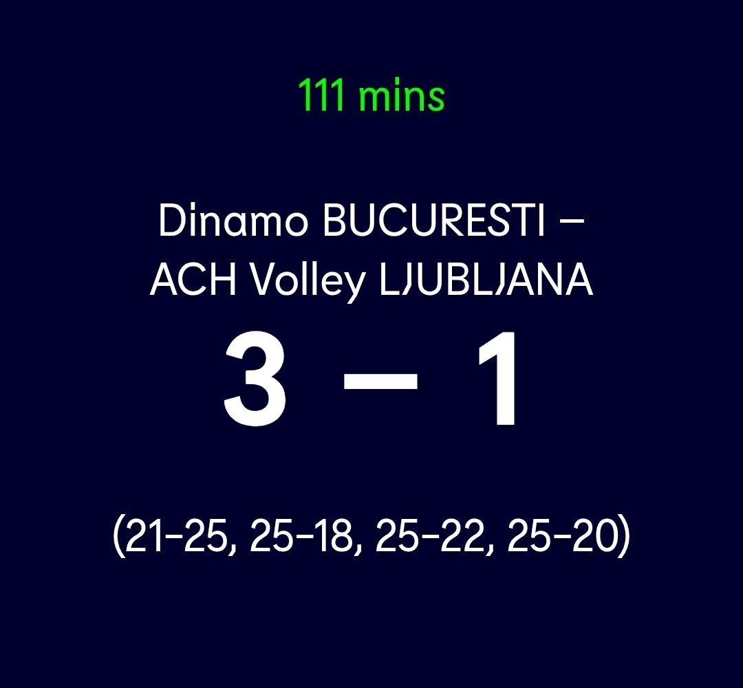 Dinamo a învins marţi, pe teren propriu pe campioana Sloveniei, ACH Volley Ljubljana, scor 3-1, în prima manşă din turul II preliminar al Ligii Campionilor.