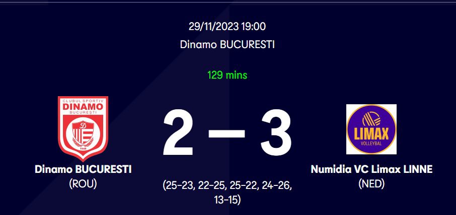 Dinamo s-a calificat în optimile de finală ale Cupei Challenge la volei masculin, chiar dacă a pierdut acasă cu 2-3, fiind învinsă de Numidia VC Limax Linne, miercuri seara, în manşa secundă a şaisprezecimilor de finală.