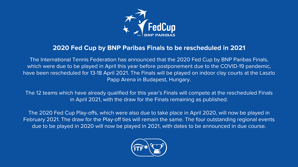 Federaţia Internaţională de Tenis a anunţat, că play-off-ul Fed Cup şi turneul final al competiţiei au fost amânate pentru 2021, din cauza pandemiei de CORONAVIRUS.
