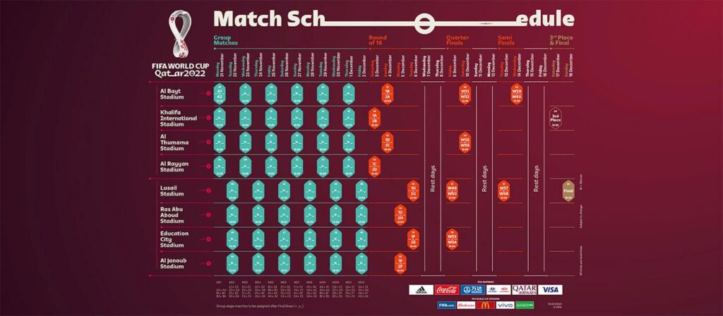 Turneul final va debuta în data de 21 noiembrie 2022, atunci când gazda Qatar va juca primul meci la Mondial pe stadionul Al Bayt, o arenă cu 60.000 de locuri.