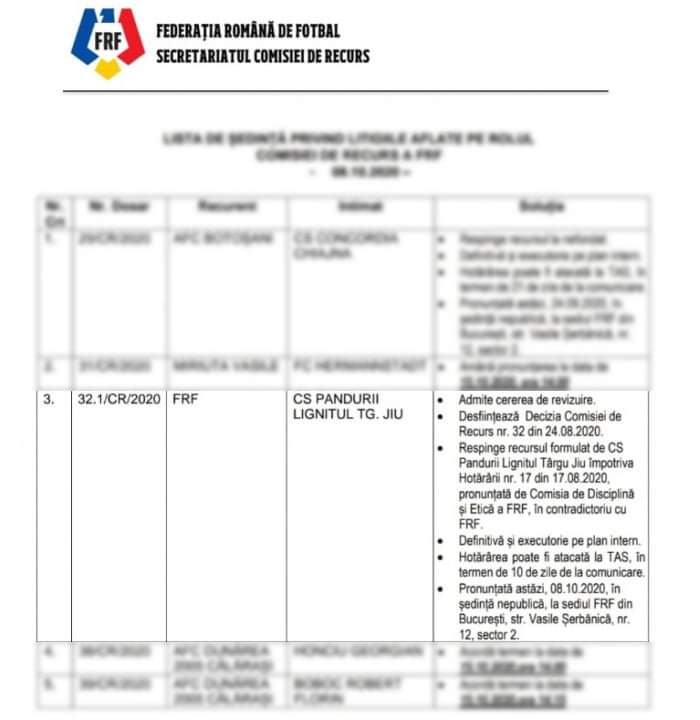 Comisia de Disciplină și Etică a Federației Române de Fotbal a decis să excludă Pandurii Tg. Jiu, informează site-ul frf.