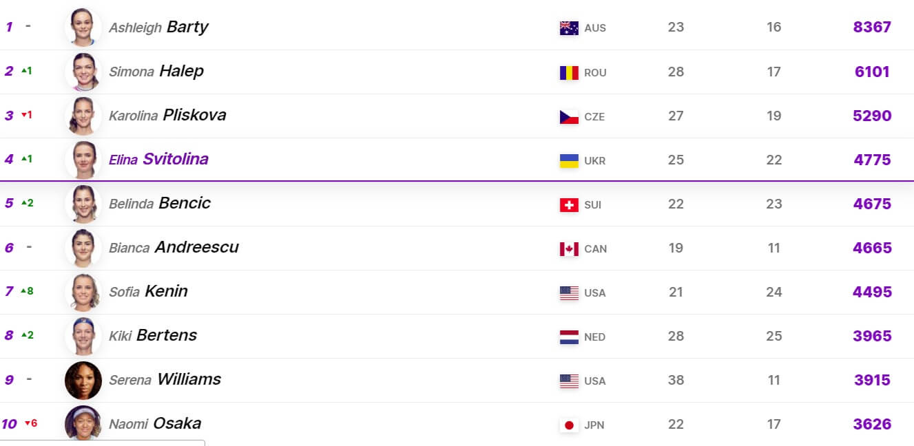 Ashleigh Barty îşi păstrează poziţia de lider, cu un avans de peste 2.200 de puncte faţă de Simona Halep, care are la rândul său peste 800 de puncte mai mult faţă de a treia clasată, Karolina Pliskova (Cehia).