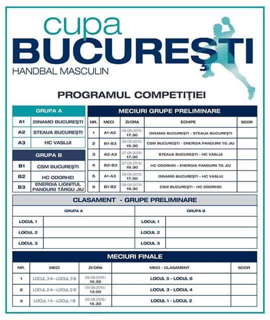 Clubul Sportiv Municipal București organizează, în perioada 6-9 august, la Sala Rapid din Capitală, ”Cupa București” la handbal masculin, competiție care va reuni șase dintre cele mai valoroase echipe din Liga Națională masculină. Participantele vor fi împărțite în două grupe, astfel: Dinamo București, Steaua București, HC Vaslui (Grupa A) și CSM București, HC Odorhei, Energia Lignitul Pandurii Tg. Jiu (Grupa B).