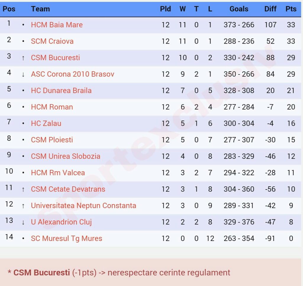 În primul meci din etapa 12 a Ligii Naţionale, HCM Baia Mare a învins în deplasare, la Slobozia, CSM Unirea, la scorul de 33-21 (14-12).HC Zalau a obtinut o victorie importanta in fata echipei HCM Roman scor 24-17 .