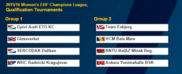 În Grupa 1 preliminară se află Gyori Audi ETO KC (Ungaria), câştigătoarea Champions League în 2013 şi 2014, Glassverket (Norvegia), SERCODAK Dalfsen (Olanda) şi WHC Radnicki Kragujevac (Serbia).