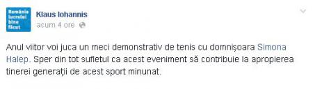 ”Anul viitor voi juca un meci demonstrativ de tenis cu domnişoara Simona Halep. Sper din tot sufletul ca acest eveniment să contribuie la apropierea tinerei generaţii de acest sport minunat”, a scris, luni, Klaus Iohannis pe pagina sa de Facebook.