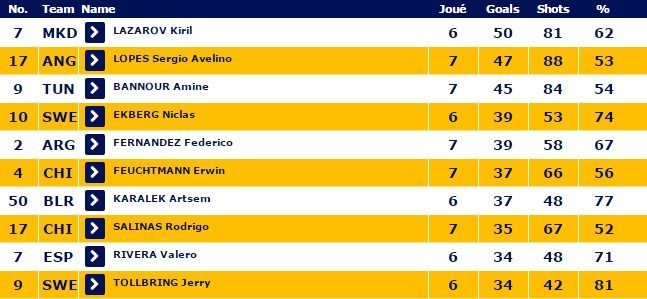După 14 zile la Campionatul Modial de handbal masculin din Franța, macedonianul LAZAROV conduce în clasamentul gogheterilor cu 50 de reușite din 81 de șuturi cu un procentaj de 62%.