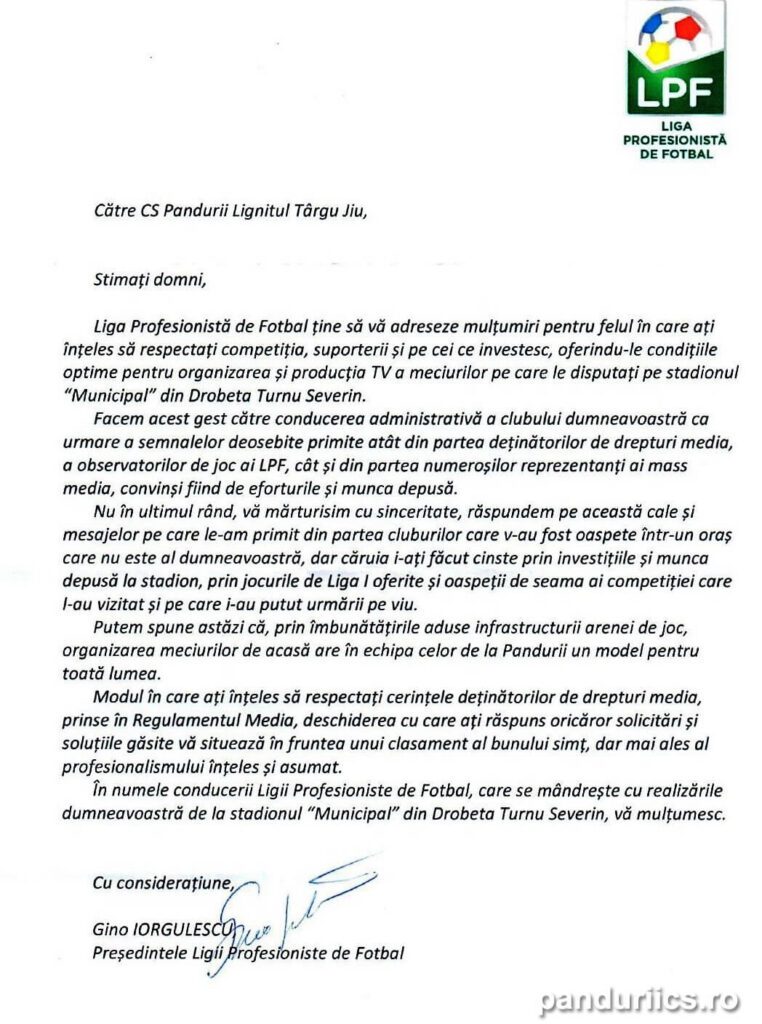Printr-o scrisoare trimisă clubului gorjean. Federația Română de Fotbal a lăudat meciurile disputate de Clubul Pandurii Târgu Jiu la Severin.