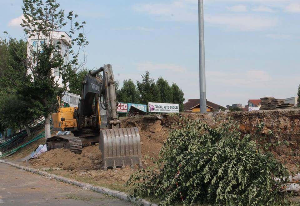 Imagini de la demolarea peluzei de langa Sala Sporturilor. După ce s-au demontat scaunele din plastic şi gardurile metalice, de azi s-a trecut la acţiunea de demolare a primei peluze a Stadionului Municipal, cea de la vechea tabelă de marcaj.