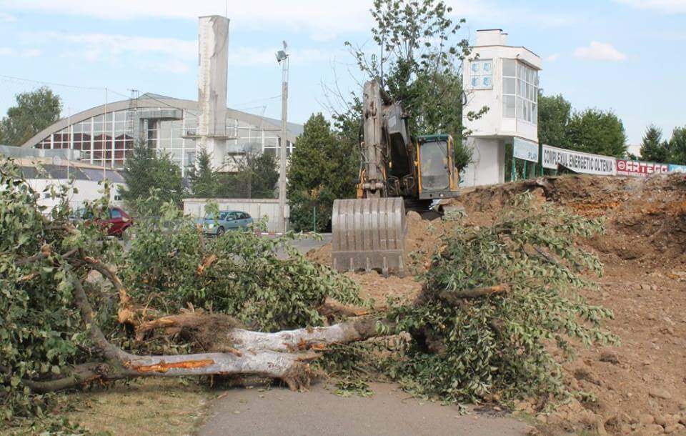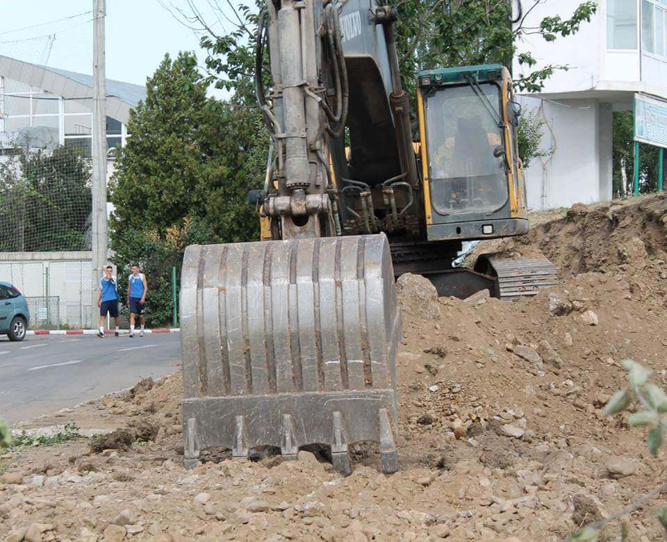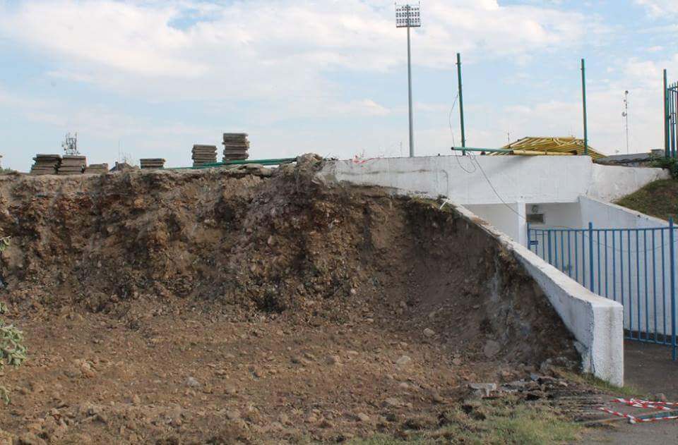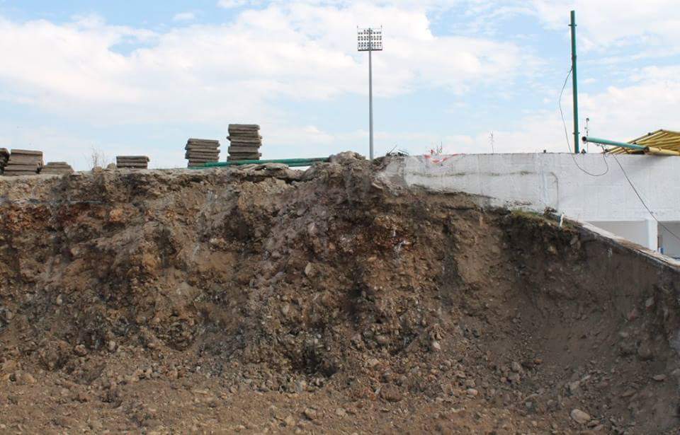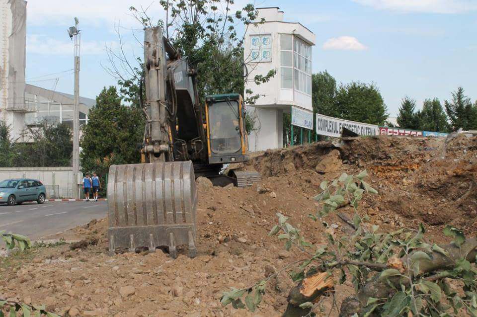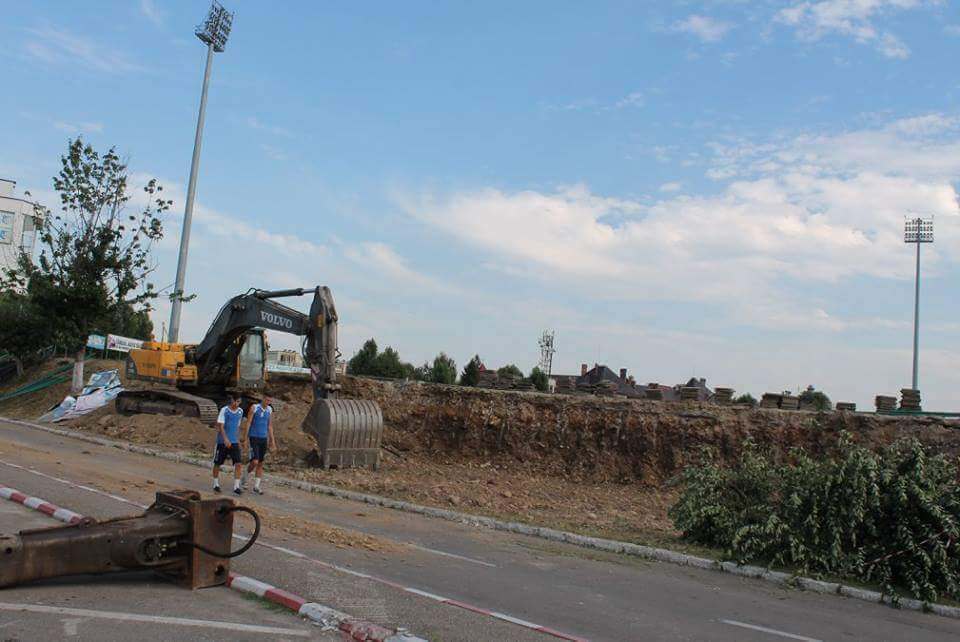 Imagini de la demolarea peluzei de langa Sala Sporturilor. După ce s-au demontat scaunele din plastic şi gardurile metalice, de azi s-a trecut la acţiunea de demolare a primei peluze a Stadionului Municipal, cea de la vechea tabelă de marcaj.