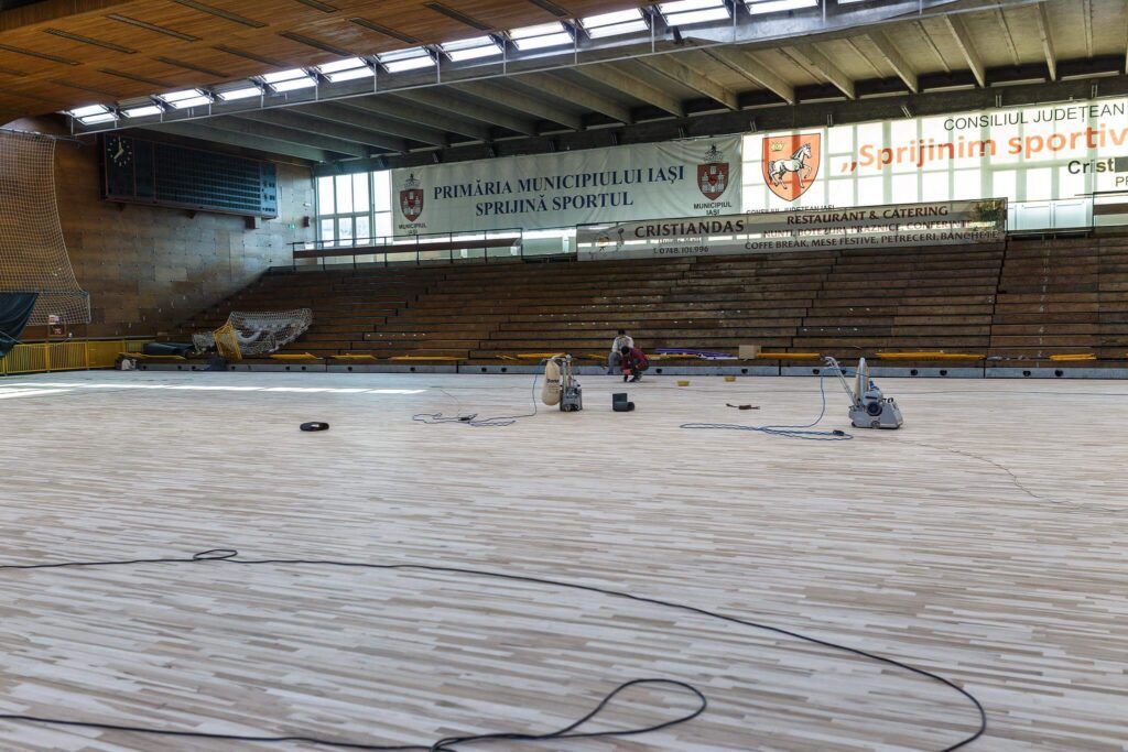 Primăria Iaşi a ajuns să se „mândrească” cu înlocuirea vechii suprafețe din taraflex, cu una nou nouță din parchet de arțar american.