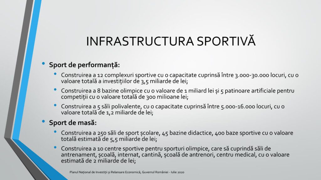 * construirea a 250 de săli de sport şcolare, 45 de bazine didactice, 400 de baze sportive cu o valoare totală estimată de 5,5 miliarde de lei;
