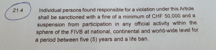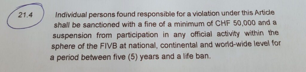 „Art. 21.4 persoanele fizice găsite responsabile de violarea acestui articol, vor fi sancționate cu amendă de minimum 50.000 franci și suspendarea de la participarea la orice activitate oficială din sfera FIVB atât la nivel național cât și continental sau mondial pe o perioadă între 5 ani și pe viață.”