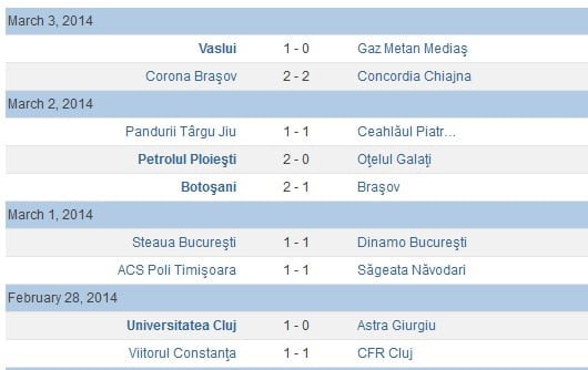 Rezultate din cadrul etapei a 21-a, FC Viitorul a terminat la egalitate, scor 1-1 (0-0), cu echipa CFR Cluj, Astra Giurgiu a fost învinsă, vineri seară, în deplasare, cu scorul de 1-0 (1-0), de echipa Universitatea Cluj,