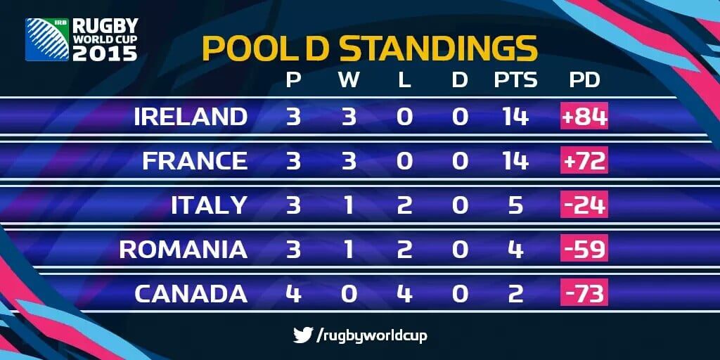Dupa o partida dramatica, Stejarii au obtinut prima victorie la Cupa Mondială din Anglia. Desi a condus cu 15-0, Canada a trebuit sa se recunoasca invinsa, doua eseuri marcate de Macovei si o penalitate a lui Vlaicu in final, aducandu-ne succesul cu 17-15.Pentru România au marcat Mihai Macovei (două eseuri) şi Florin Vlaicu (două transformări, o lovitură de penalitate).