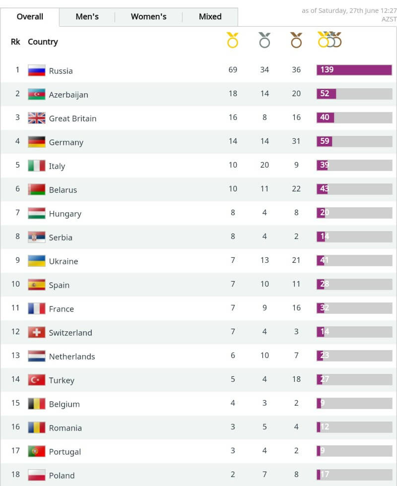 Rusia conduce detașat în clasament cu 139 de medalii, 69 de aur, 34 de argint și 36 de bronz, fiind urmată de către Azerbaidjan 52 medalii, 18 de aur, 14 argint si 20 de bronz.
