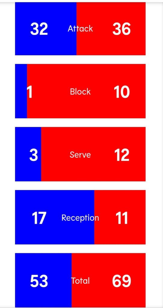 Cele mai bune tricolore: Adelina Budai-Ungureanu a reușit 12 puncte în timp ce Nneka Onyejekwe 9 puncte. De la azere s-au remarcat Polina Rahimova, cu 30 puncte. La fileu tricolorele au reușit doar un blocaj, în timp ce de adversarele au blocat de zece ori.