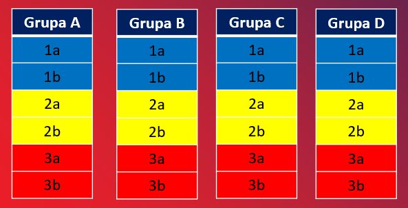 Pentru fiecare grupă în parte, primei echipe extrase din urna valorica 1, respectiv 2 i se va atribui denumirea generică “1a”, respectiv “2a”, iar cea de-a două extrasă va primi denumirea de “1b” și “2b”. În acelasi timp, echipele din urna valorică 3, deja împarțite în grupe, vor primi prin tragere la sorți denumirea generică “3a” și “3b”.
