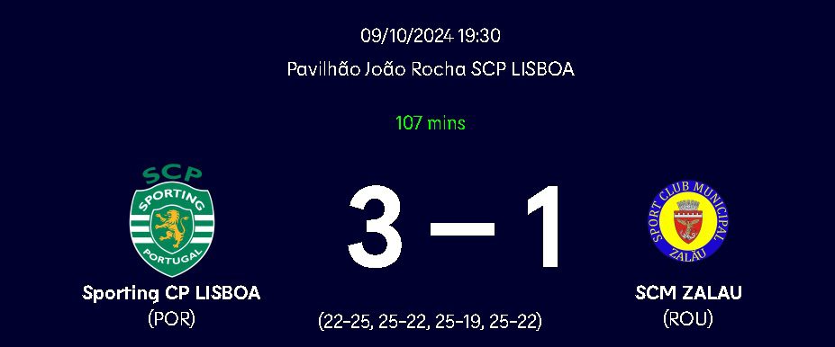 Oleksandr Buzdugan (11 puncte) şi Victor Hugo Simoes Rosa Santana (10) s-au remarcat de la zălăuani.Cei mai buni jucători ai echipei lusitane au fost Edson Alberto Valencia Gonzalez (19 puncte), Jan Galabov (15) şi Martin Licek (10).