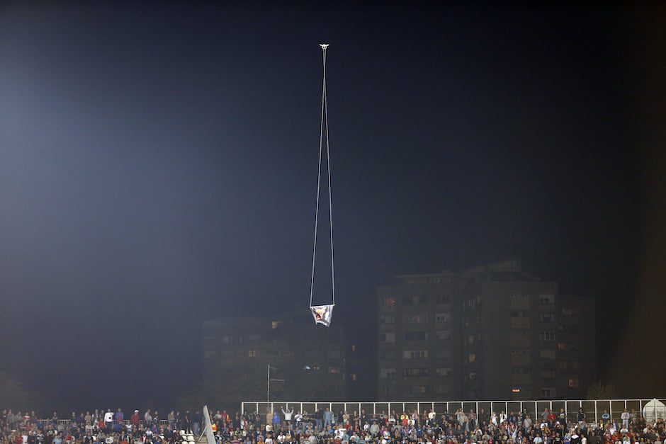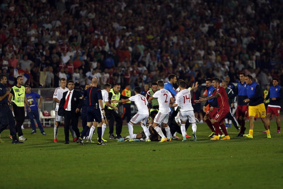 O dronă cu un drapel albanez a fost lanstă deasupra arenei şi a provocat furia jucătorilor sârbi, Stefan Mitrovici reuşind să prindă acest steag, moment în care a izbucnit o încăierare generală, iar fanii au intrat pe teren.informează mediafax