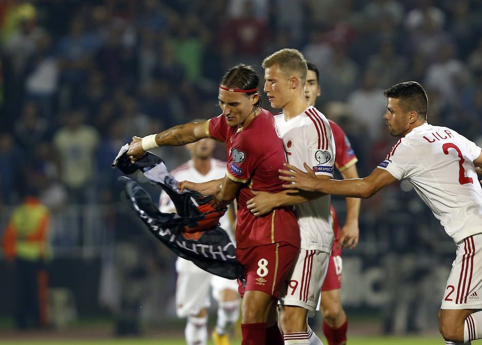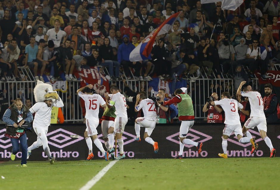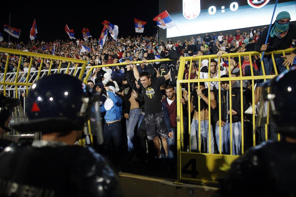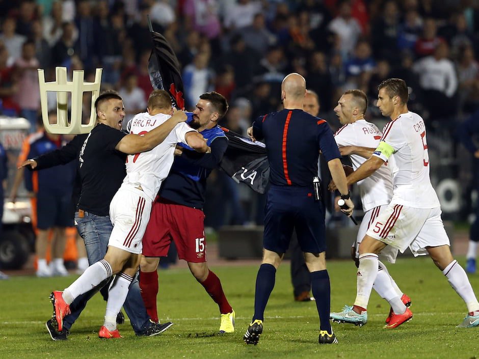 Serbia – Albania, de la Belgrad, în preliminariile Euro-2016, a fost întrerupt în minutul 41, din cauza incidentelor, la scorul de 0-0, iar apoi a fost suspendat definitiv.