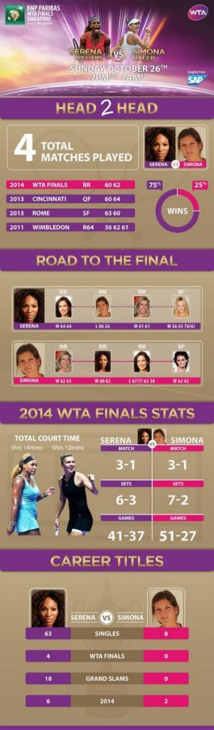 Dupa patru zile de la ultima întâlnire pe care Halep a dcastigat-o, Williams este foarte periculoasa. Serena a câştigat ultimele două finale de la Turneul Campioanelor.Americanca în vârstă de 33 de ani a disputat şase finale în 2014 şi le-a câştigat pe toate: Brisbane, Miami, Roma, Stanford, Cincinnati şi US Open. De partea celaltă, Halep a mai ajuns in trei finale în 2014, Doha, Roland Garros şi Bucureşti, castigand doua din cele trei în Qatar şi România.