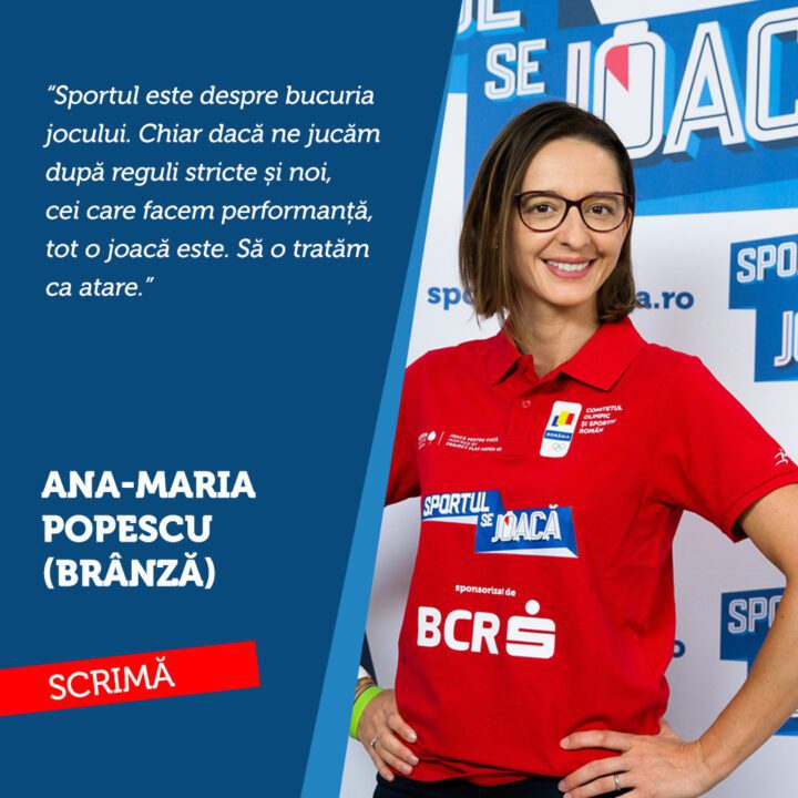 „Toată copilăria mea a fost o bucurie nemărginită pentru că aveam libertate. Mi-am petrecut mare parte din copilărie în spatele blocului unde, dacă ne plictiseam de toate jocurile pe care le știam: șotronul, elasticul etc., inventam noi unele noi. Cred că părinții mei își aduc aminte foarte bine toate tricourile și toți pantalonii pe care i-am agățat în diverse garduri. „Sportul se joacă” acoperă o plajă foarte mare, de la copii la adulți, profesori de educație fizică și mai ales pe noi, sportivii, ne ajută să transmitem mai departe mesajul că sportul face bine. Așadar, Sportul se joacă!” – Ana Maria Popescu.