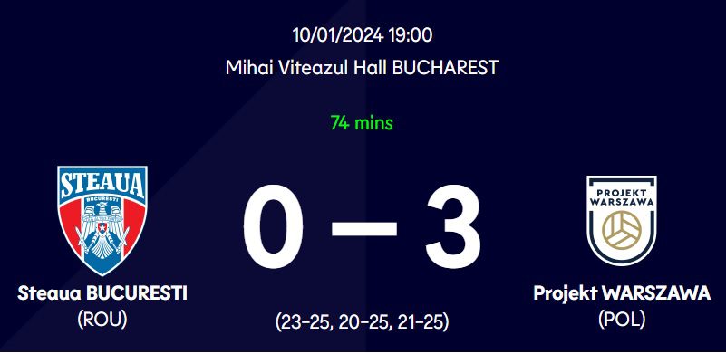 CSA Steaua a fost învinsă de echipa poloneză Projekt Varşovia, cu scorul de 3-0, miercuri seara, în Sala ”Mihai Viteazul” din Capitală, în prima manşă a sferturilor de finală ale Cupei Challenge la volei masculin.