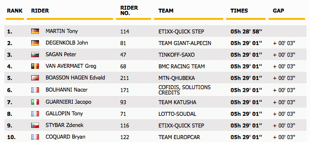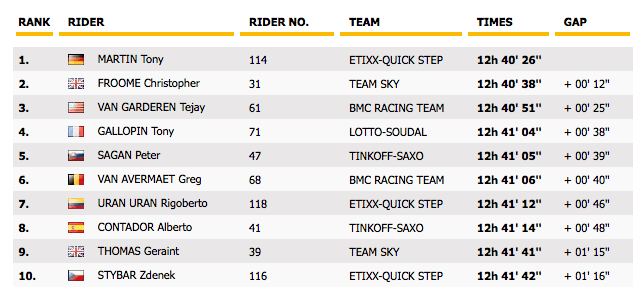 În urma acestei victorii, Tony Martin a preluat tricoul galben fiind urmat de Chris Froome de la Sky la 12 secunde.