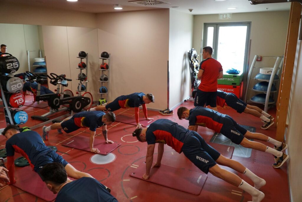 Selecționerul Adrian Mutu a decis ca elevii săi să aibă parte în această dimineață de un antrenament în sala de forță. Cei 23 de jucători au fost împărțiți în trei grupe și au mers pe rând la antrenament. Fiecare grupă a lucrat aproximativ 20 de minute.
