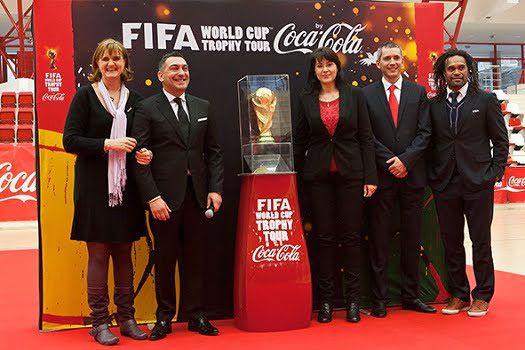 Turneul global al ”Trofeului Cupei Mondiale” a început în septembrie 2013 și parcurge peste 148.000 de kilometri în decursul a 9 luni. Prestigiosul trofeu a venit însoțit la București de fostul fotbalist francez Christian Karembeu, în calitate de ambasador FIFA. ”Vă aștept la Campionatul European din 2016, din Franța”, a fost mesajul lui Karembeu pentru fanii fotbalului românesc.