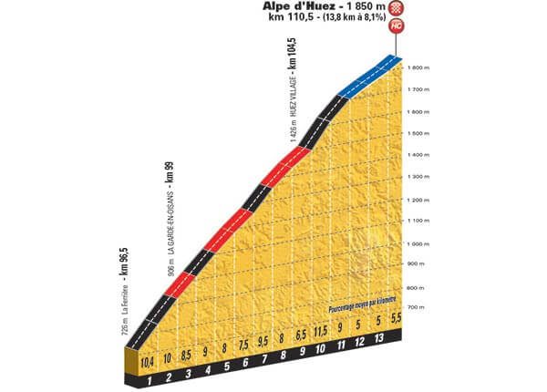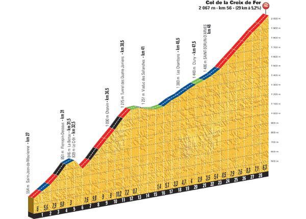 Profilul etapei Modane Valfréjus / Alpe d’Huez 110.5KM Km 56.0 – Col de la Croix de Fer (2 067 m)29 kilometre-long climb at 5.2% – category H Km 110.5 – ALPE D’HUEZ13.8 kilometre-long climb at 8.1% – category H