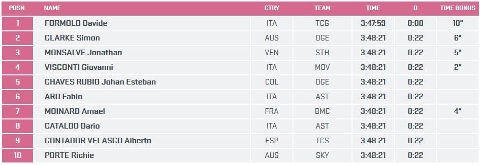 La prima participare in marele tur, Davide Formolo, la numai 22 de ani, a câștigat etapa a 4-a, trecând primul linia de sosire fiind urmat de australianul Simon Clarke, la 22 de secunde, dar care a castigat sprintul intermediar, a preluat tricoul roz de lider al clasamentului general, păstrându-l pentru echipa Orica-GreenEdge.