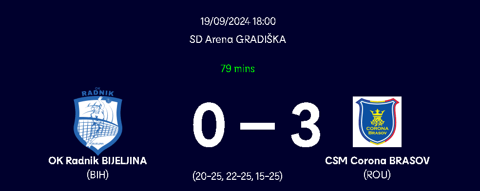 Dacă va trece de Radnik Bijeljina, Corona va juca în turul al doilea cu învingătoarea duelului Volley Schoenenwerd-SK Jekabpils Lusi, în tur Schoenenwerd a câștigat cu 3-1.
