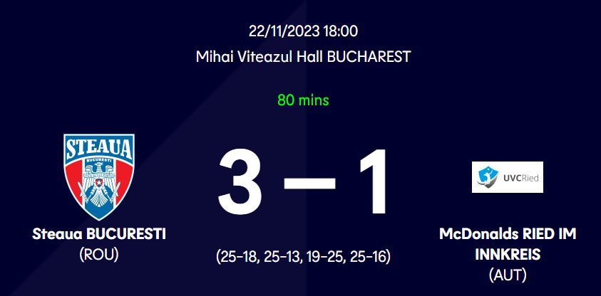 CSA Steaua a învins-o pe echipa austriacă McDonalds Ried im Innkreis, cu scorul de 3-1 (25-18, 25-13, 19-25, 25-16), miercuri, pe teren propriu, în prima manşă a şaisprezecimilor de finală ale Cupei Challenge la volei masculin.